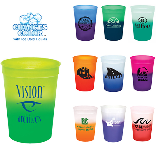 This 13 oz. Mood Stadium Cup changes color with ice cold liquids. Appreciate the fans with this unique sports cup. Made of durable plastic and available in 4 vibrant colors. Hand wash recommended. Hand wash recommended. Price includes one color imprint, one location.