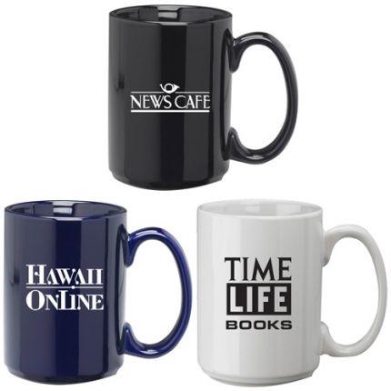 Large straight walled 15oz Ceramic Mug. Large handle for comfortable grip. Microwave safe. Hand wash for mugs is recommended. Bulk Packed. Price includes one color, one location imprint.