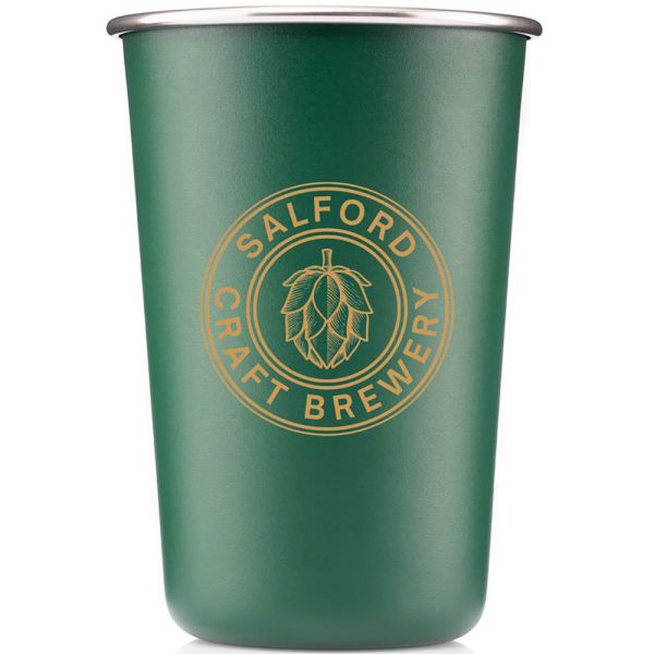 16 oz single wall stainless steel pint cup tumbler. Powder-coated finish. Stackable, durable. Uses: Ice cream, juice, beer. Price includes one color, one location imprint.