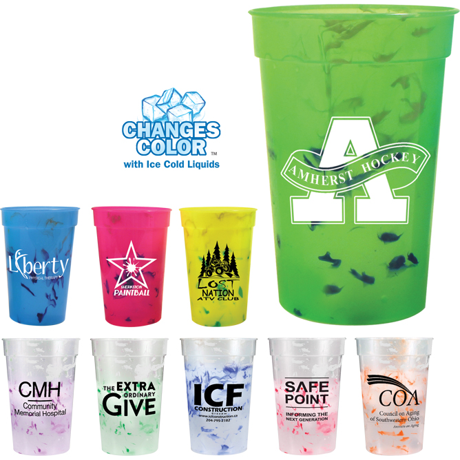 Confetti pattern changes color with ice cold liquids. Top shelf dishwasher safe. Price includes one color, one location imprint.