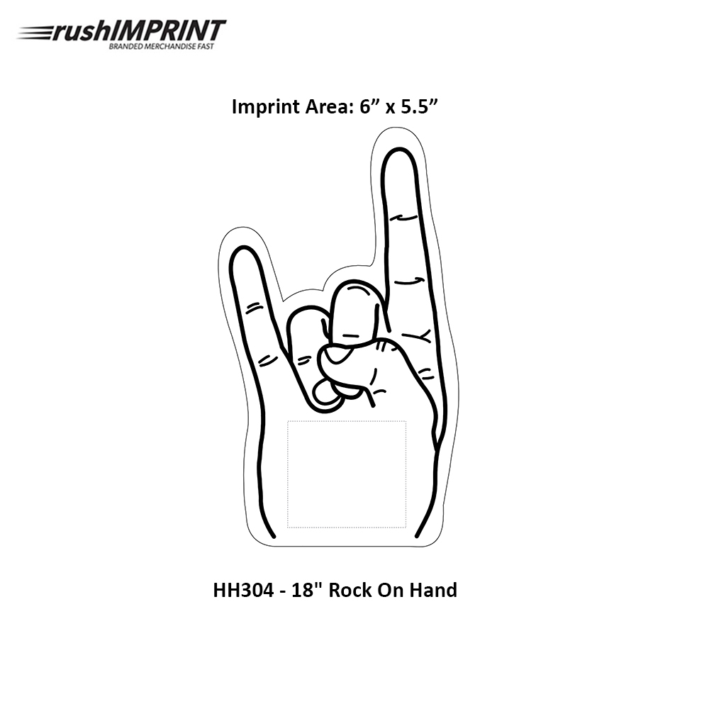 Catalog Year 2025. 18" Rock On Hand. FOB: Maine 04619. Price includes one color imprint on one side. 2nd side print with additional charges. See Product Options. Your business will get lots of fun fan support with this latest hand-shaped cheering style! Our open cell foam "rock on" horn hand cheering waver measures 17.25" high, and it's available in lots of colors with silkscreen or full color digital imprint. Perfect for sports events, pep rallies, political conventions or concerts! Price includes one color, one location imprint.