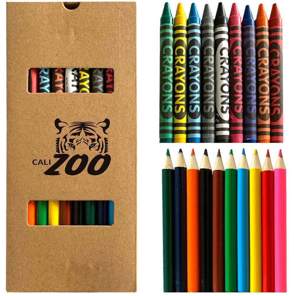 Set Includes 9 Crayons and 10 Pencils. Crayon Colors Include Black, Blue, Carnation Pink, Gray, Green, Indigo, Orange, Red And Yellow. Pencil Colors Include Black, Blue, Brown, Dark Green, Light Blue, Light Green, Orange, Pink, Red and Yellow. Price includes one color, one location imprint.