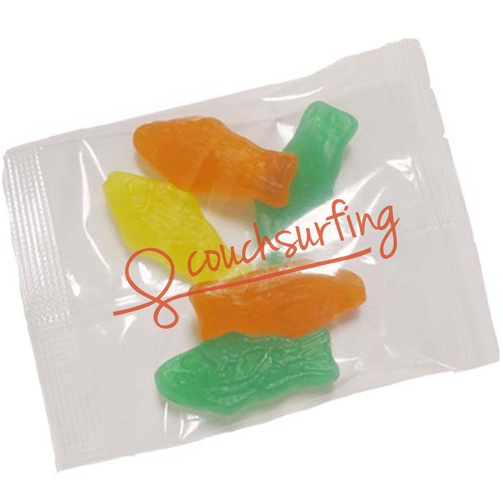 1oz. Assorted Fish Goody Bag. Perfect for parades, trade shows or any event where you want to give an inexpensive, colorful and delicious treat. Labeled bag dimensions: 3" x 4". Non melt product. Price includes full color imprint.