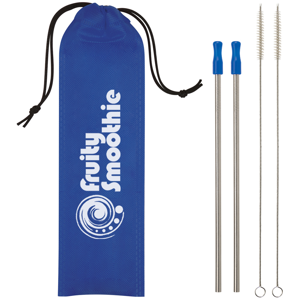 Two Stainless Steel Straws, Two Silicone Tips and Non-Woven Travel Pouch. Reusable. Includes Two Wire Cleaning Brushes. Hand Wash Recommended. Price includes one color, one location imprint.