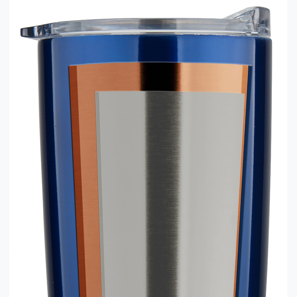 BPA-Free. Stainless steel outer and inner walls. Copper-lined. Double-wall vacuum insulated. Keeps drinks hot or cold for hours (keeps cold up to 18 hours and keeps hot up to 8 hours). Spill-resistant slide lid w/rubber gasket. Sweat-resistant. Ships assembled. Hand wash recommended. All tumblers come with clear lid unless otherwise. specified. Full color imprints are varnish coated for shine and durability. Price includes one color, one location imprint.
