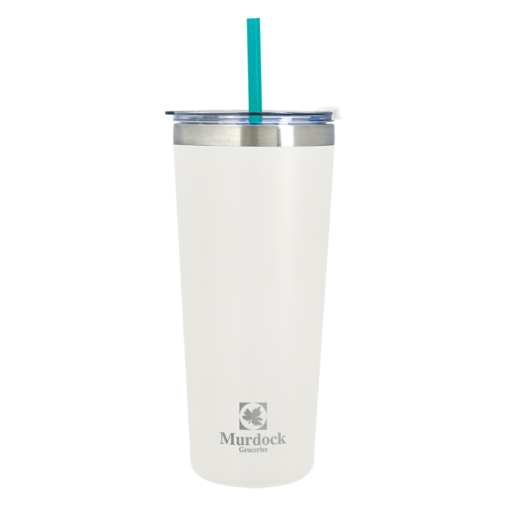 Stainless Steel Outer And Inner. Double Wall Construction For Insulation Of Hot Or Cold Liquids. Vacuum Insulated. Snap-On, Spill-Resistant Flip Top Lid with Straw Hole and Matching 9 1/2" Straw. Non-Slip Bottom. Meets FDA Requirements. BPA Free. Hand Wash Recommended. All Black Tumbler with Clear Lid and Black Flip-Top Accent. All White Tumbler with with Clear Lid and White Flip-Top Accent.