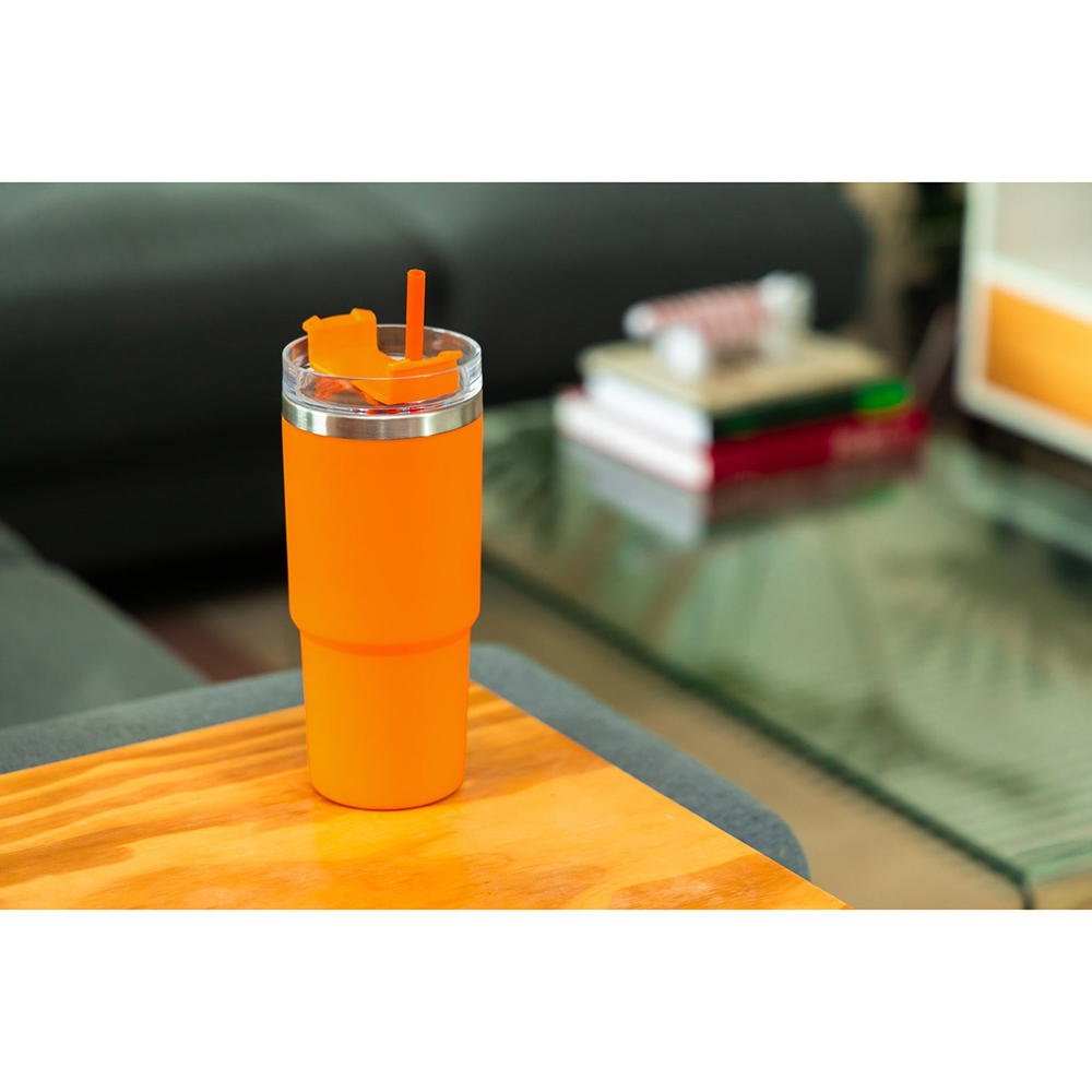 24 oz Double Wall Reusable Tumbler with Straw. Made from 100% Recycled Plastic outer and 90% Recycled Stainless Steel inner.Double Wall Construction For Insulation Of Hot Or Cold Liquids. Screw-On, Spill-Resistant Lid with 10" Straw. Constructed to fit into standard-size car/truck cup holders. Rotating lid that offers two drinking options: a straw for cold drinks on one side and an opening for hot drinks on the other. Price includes one color, one location imprint.
