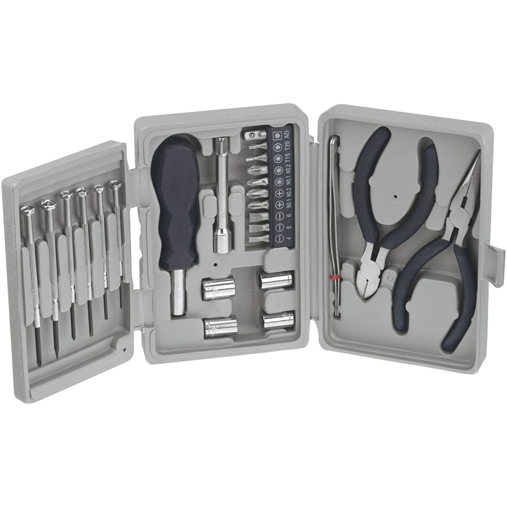 The 26 Piece Deluxe tool Kit includes six precision screwdrivers, an extension rod, a bit driver with a plastic handle, a 10-piece screwdriver bits in a bit holder, needle-nose pliers and diagonal wire cutters with matte grip handles, four wrench sockets and a pair of tweezers. The four wrench socket sizes are 7, 8, 9, and 10 MM. It also includes a tri-fold heavy duty case with a snap closure. Material: Plastic case with carbon steel tools. Six precision screwdrivers. Extension rod and bit driver with plastic handle. 10-piece screwdriver bits with holder. Needlenose pliers and diagonal wire cutters with matte grip. Four wrench sockets sized 7, 8, 9, and 10 MM. Tweezers. Tri-fold heavy duty case with snap closure. Price includes one color, one location imprint.