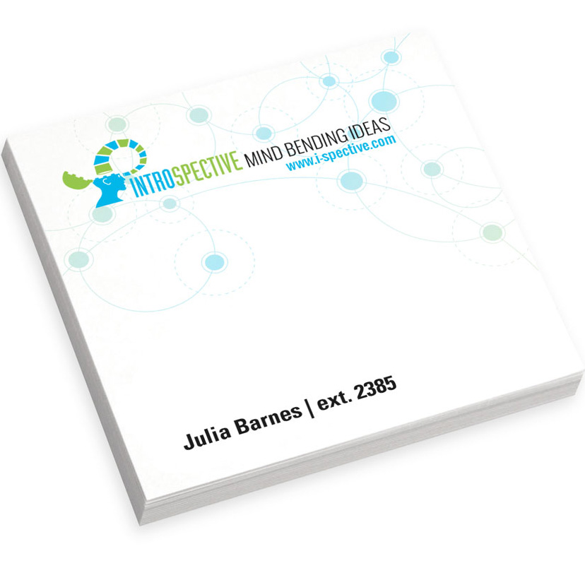 3" x 3" Adhesive Notepads 25 sheet pad. Always in stock. FREE set-up. FREE phantom imprints create visual interest!. Add color with a FREE flood coat. No charge for bleeds. Product Material: 60# Offset Paper. Price includes full color imprint.