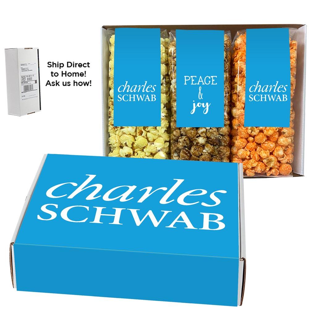3 Way Popcorn Gift Box with your choice of Gourmet or Classic Flavors. Butter Popcorn (2.5 oz.), Cheese Popcorn (3.4 oz.) and Caramel Popcorn (8 oz.). Price includes full color imprint.