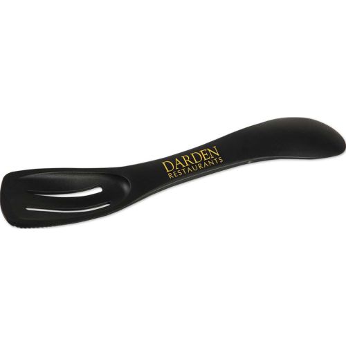 Universal tool features a spoon, slotted spoon, turner and serrated edge for a variety of kitchen jobs. Durable nylon construction can be used on grill or stove top and will withstand short term exposure to temperatures up to 375oF. Dishwasher safe. Price includes one color, one location imprint.