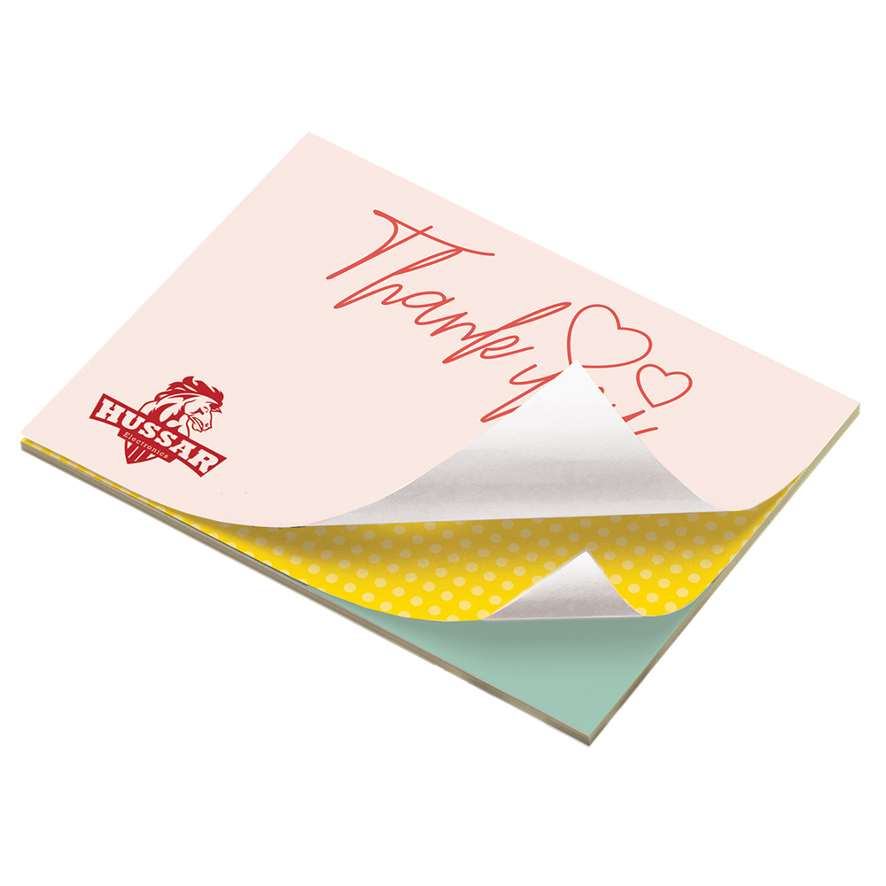 Imprint every sheet of this durable, high-quality Sticky Note pad for impactful branding time and time again. Includes 4-color process imprint with free set-up, bleeds and flood coat. Always in stock. 4-color process imprinting provides endless possibilities! Add color with a FREE flood coat. FREE set-up. Product Material: 60# Offset Paper. Price includes full color imprint.