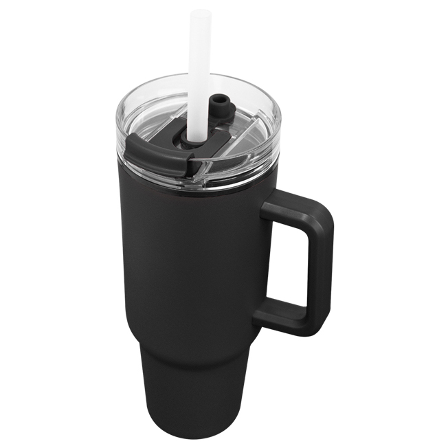 Stainless Steel Outer And Plastic Inner Liner with Handle, Powder Coated Finish, Double Wall Construction For Insulation Of Hot Or Cold Liquids, Screw-On, Spill-Resistant Lid with Straw Hole and 12" Straw, Meets FDA Requirements, BPA Free, Hand Wash Recommended
