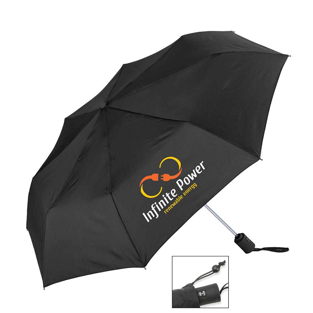 10" when closed. 43" arc. One touch automatic open / close. Pongee. Matching color rubber spray handle. Matching sleeve with bungee closure. Sleeve: Matching. Number of Panels: 8. Arc Size: 43" Open Diameter Size: 38.5" Closed Length Size: 10" Fabric Material: Pongee. Shaft Material: Steel. Ribs Material: Steel. Handle Material: Rubberized. Handle Style: Mini. Prop65: This product does not require a Prop 65 label. Price includes one color, one location imprint.