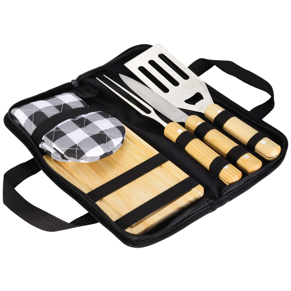 Five-piece BBQ set includes spatula with built-in bottle opener, fork, and knife (all with wooden handles), matching wooden cutting board, and a black and white plaid grilling mitt. All neatly stored in a zippered carrying case.
