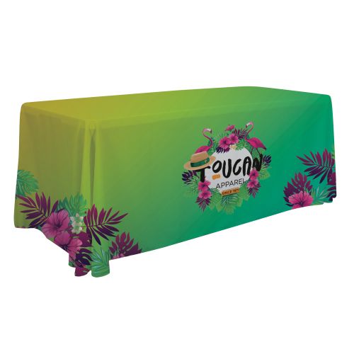 Our most economical throw! 3-sided coverage with an open back for easy access and storage. Sit comfortably behind your table. Covers 3 sides of the table with a 9.5 inches overhang in the back. Easy access for storage under table. Flame retardant, premium polyester poplin fabric. Machine washable and wrinkle resistant. Do not dry clean and do not iron. Price includes full color/full bleed.