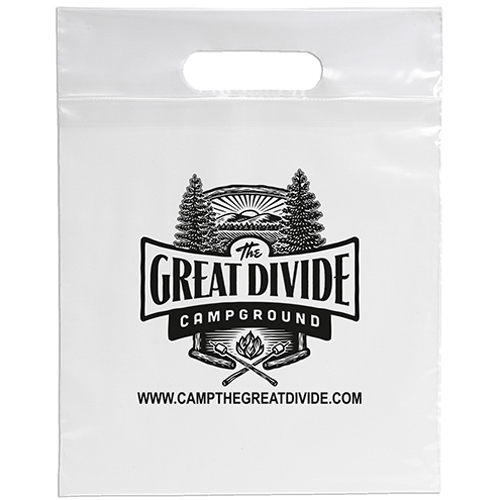 Plastic bags with fold-over reinforced die cut handles and bottom gusset on select sizes. 8-1/2 X 11 sheet of paper interferes with use of die cut handles. Price includes one color imprint, one location. Free Proof prior to production.