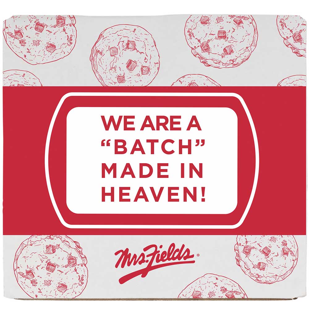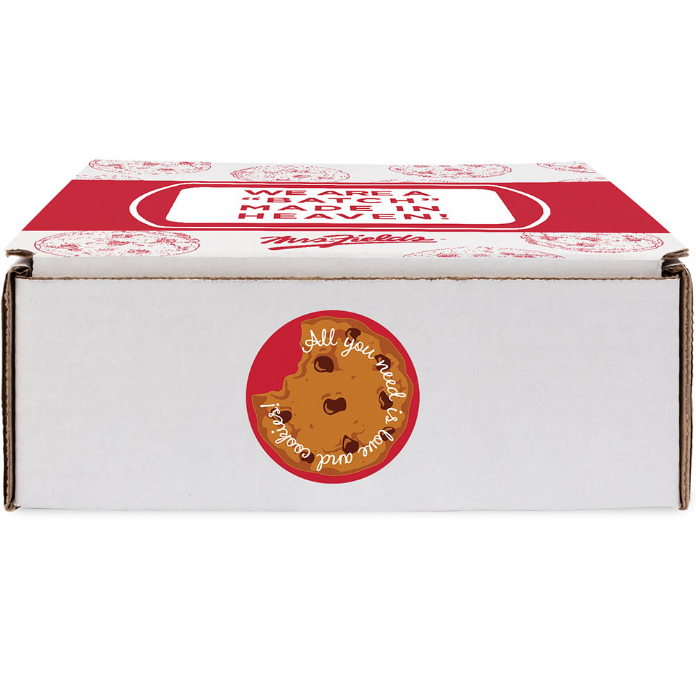 Our Mrs. Fields cookie mailer is filled with (6) cello-wrapped 3 packs of freshly made Mrs. Fields Chocolate Chip Cookie Nibblers. Top of mailer box exclaims "We're a Batch Made In Heaven. Outside sticker states "All You Need is Love and Cookies!" Comes packaged in a custom mailer box (stock design only as pictured) with red or white crinkle, outside sticker and a customizable inside label. Price includes full color imprint.
