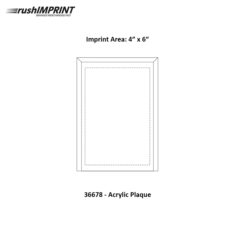 Model: 36678 Acrylic Plaque Product Description This plaque is unique because you can create a 3D effect that makes it stand out from others. Create a 3D effect by imprinting both back and front sides. Free-standing plaque with a large imprint area. Price includes laser engraving. Size: 7"h x 5"w x 1.13"d Imprint Area: 6"h x 4"w Request A Virtual Proof Choose Quantity View Price Breaks Quantity Price 6 $55.42 50 $51.96 100 $48.49 200 $45.03 Enter quantity or drag slider. Minimum quantity is 6. Quantity: Price Each $55.42 Setup Charge: $0.00 Subtotal $332.52 Savings: $ over minimum qty pricing Choose Your Quantity Quantity Price 6 $55.42 50 $51.96 100 $48.49 200 $45.03 Standard Production Time: 7 business days Select Delivery Date Enter ZIP Code Apply Loading... Choose a Shipping Method -- Loading Shipping Prices -- Customize it! Upload Your Art Now Or Send it Later. Select Imprint Color(s) Back to Edit Product Color And Quantity Where on the item should we print your design? 4" x 6" Available print design areas 4" x 6" Quantity: 6 Add Your Artwork Add Artwork Add Now Send After Checkout Don’t have artwork? That’s ok! Artwork is not required to start a job. Simply skip this step and email us artwork later (helpdesk@claytonkendall.com). If you need assistance with your art, our designers can help with that too! Will I be able to approve my design before it goes into print? Yes! You will receive a digital mock-up of your artwork on this item within a few hours of placing your order. We will send your order into production only after you approve the mock-up. Only Image Aa Only Text Aa Text/Image Designer Contact Us Enter Your Text Choose file Uploading logo. Please wait... Personalize your design by adding text and customizing its shape with a curve. Upload your logo to give it a professional touch, and combine these elements to create a one-of-a-kind design that’s uniquely yours. Open Product Designer Don’t have artwork? That’s ok! Artwork is not required to start a job. Simply skip this step and email us artwork later. If you need assistance with your art, our designers can help with that too! Will I be able to approve my design before it goes into print? Yes! You will receive a digital mock-up of your artwork on this item within a few hours of placing your order. We will send your order into production only after you approve the mock-up. Free art proof will be emailed with every order within one business day Total (loading...) qty x Set Up Shipping Cost Rush Charge Custom Fields Hazmat Fee Estimate arrival Savings Add to Cart Updating Price...