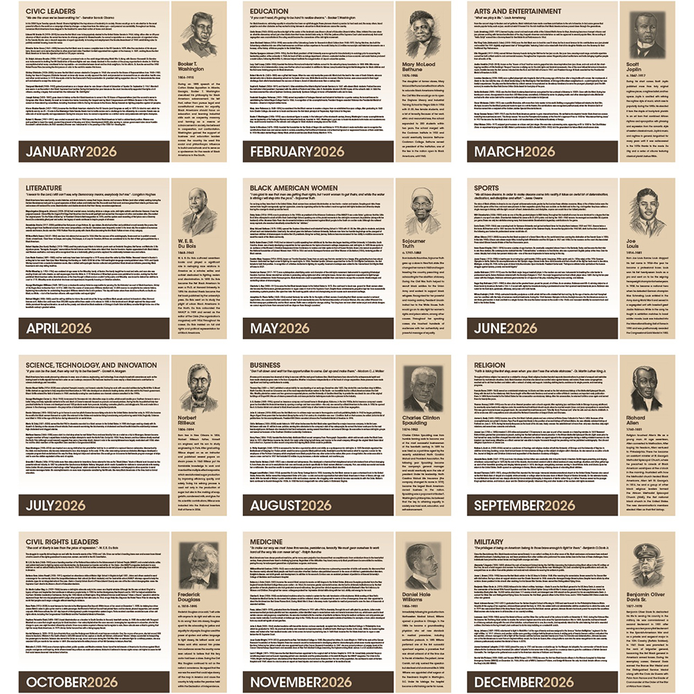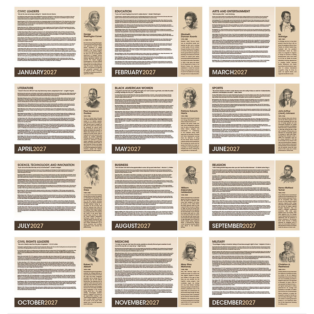 Celebrate the accomplishments of African Americans with this detailed, educational calendar. Every date highlights an event in Black history, and monthly bios delve deeper into the fascinating lives of some of America's most prominent African Americans. Features Dr. Martin Luther King Jr. on the cover. The FSC® label means that the materials used for this product come from well-managed FSC®-certified forests and other controlled sources.