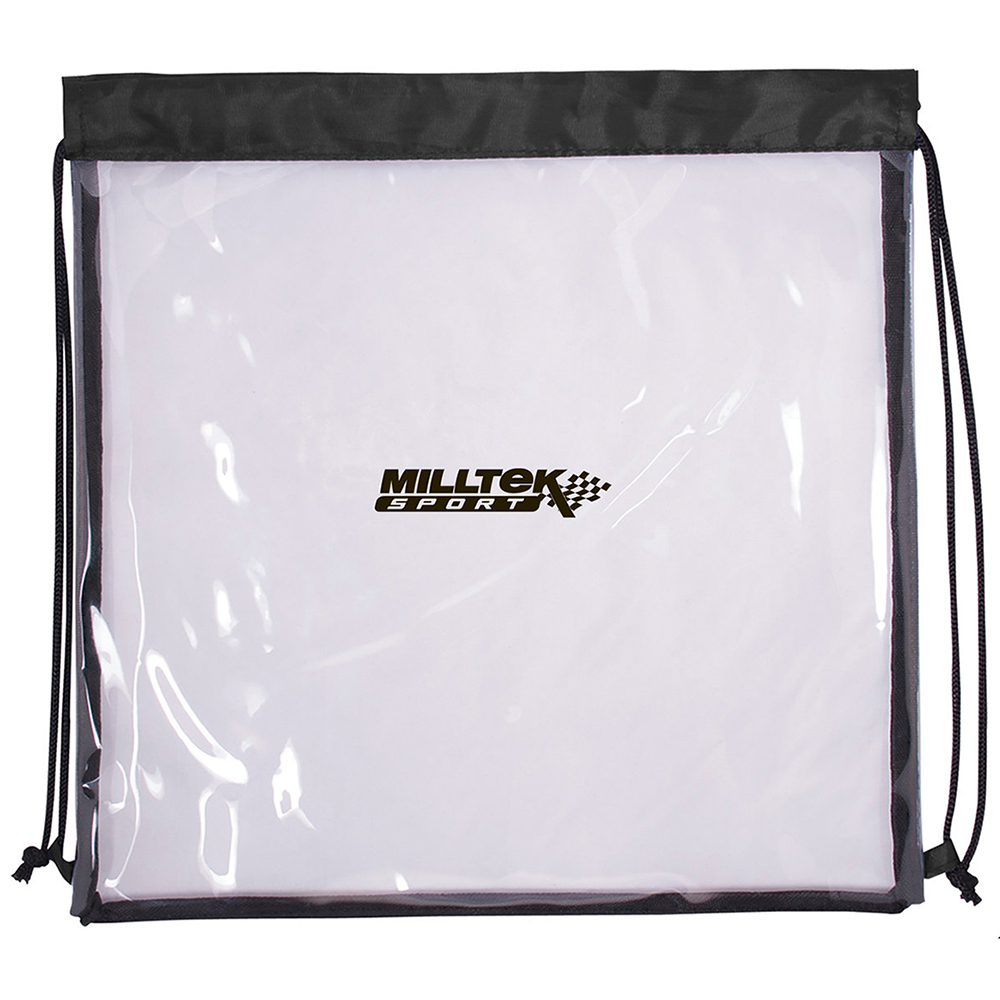 Clear 0.3 mm PVC drawstring backpack with black non-woven trim. Shoulder strap doubles as drawstring cinch-up closure. Designed to meet new NFL stadium restrictions. Also great for work place and school security. Recommended weight tolerance: 22 lbs. *24-hour rush service only applies to catalog quantities up to 800 units. Dimensions: