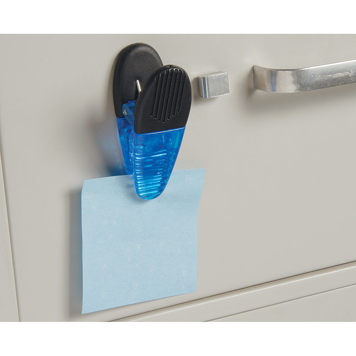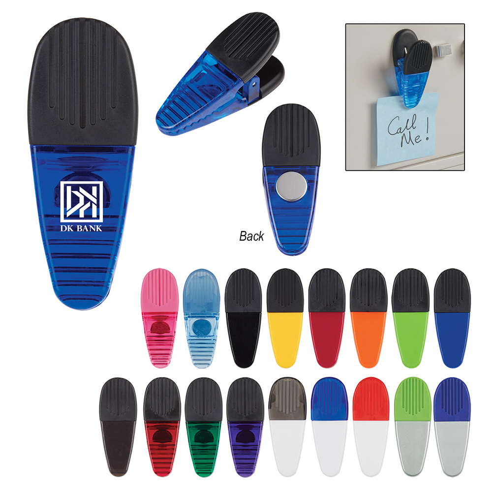 Alligator power clip with spring loaded hinge. Features powerful magnet on back side with large rubber grip. Large imprint area. Great for office or home use. Price includes a one color imprint, one location.