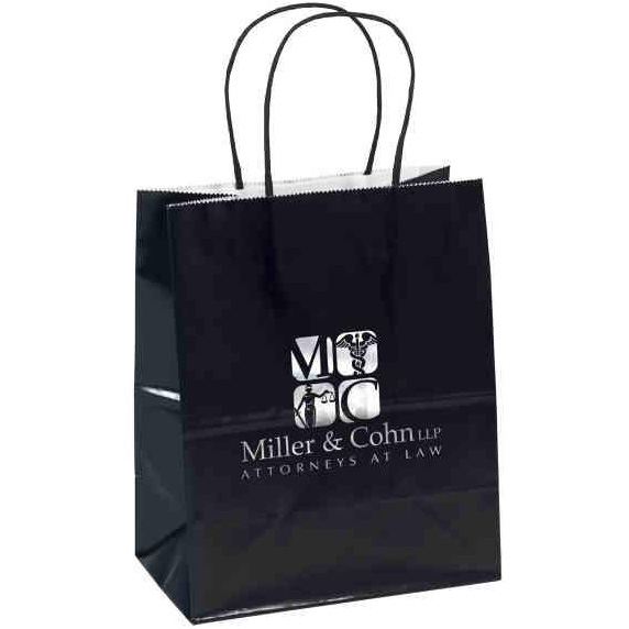 Gloss paper shopper with serrated cut top and twisted kraft paper handles. Price includes 1 color foil imprint. Free Proof prior to production.