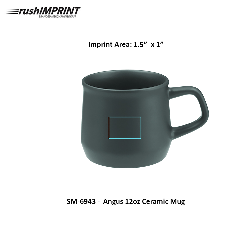 The Angus 12oz Ceramic Mug combines a matte exterior and interior finish with a unique shape and cozy handle. See General Information page for special ceramic item handling charge. Hand wash only and follow any included care guidelines. Microwave-safe. Price includes one color, one location imprint.
