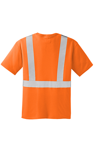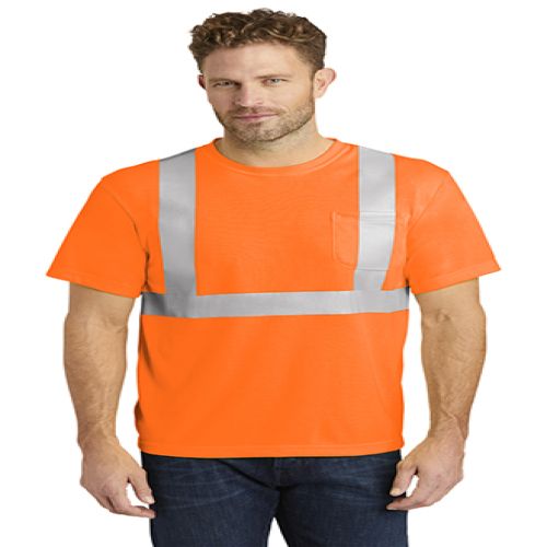 Stay safer on the jobsite in this high-visibility t-shirt that works as hard as you do. ANSI/ISEA 107 Class 2 certified. 5.9-ounce, 100% polyester interlock. Wicks moisture. 2-in. wide reflective taping on front and back. Left chest pocket for pens and notes.