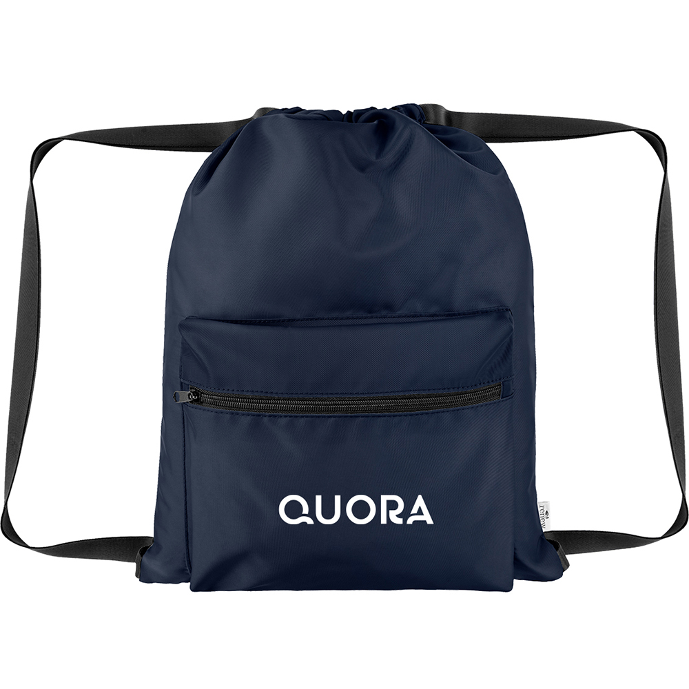 Made Of Combo: 230D rPET And Twill Polyester With PU Backing And Polyester Webbing. Made From Post Consumer Recycled Materials. Recycled Polyester (rPET) Is Obtained By Melting Down Existing Plastic Bottles And Other Material Sources To Create New Polyester Fiber. Backing, Straps, Trims And Label Are Not rPET. Drawstring Closure. Adjustable Shoulder Straps. Front Zippered Pocket. Spot Clean/Air Dry. Price includes one color, one location imprint.
