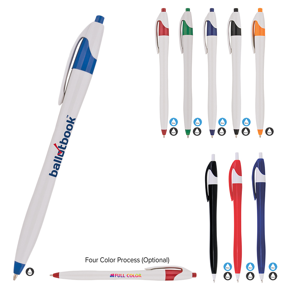 This pen offers high-class writing experience for a budget price.. It features a high gloss, white contour barrel, and a matching plastic plunger.. Use it as a giveaway or bring it along when you travel and hand it out as a business card.. Price includes one color, one location imprint.