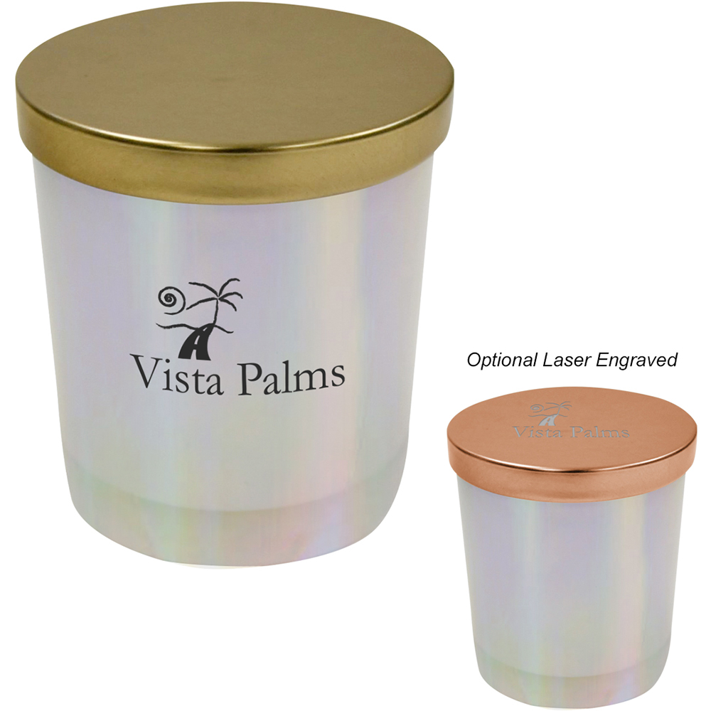 Soda Lime Glass. Soy Wax With Vanilla Fragrance. Single Wick. Non-Toxic And Burns Cleaner Than Paraffin With No Petrol-Carbon Soot. Longer Burning And More Efficient Than Paraffin. Soybeans Are A Renewable Resource And Biodegradable. Iridescent Jar with Metallic: Copper or Gold Lid. Price includes one color, one location imprint.