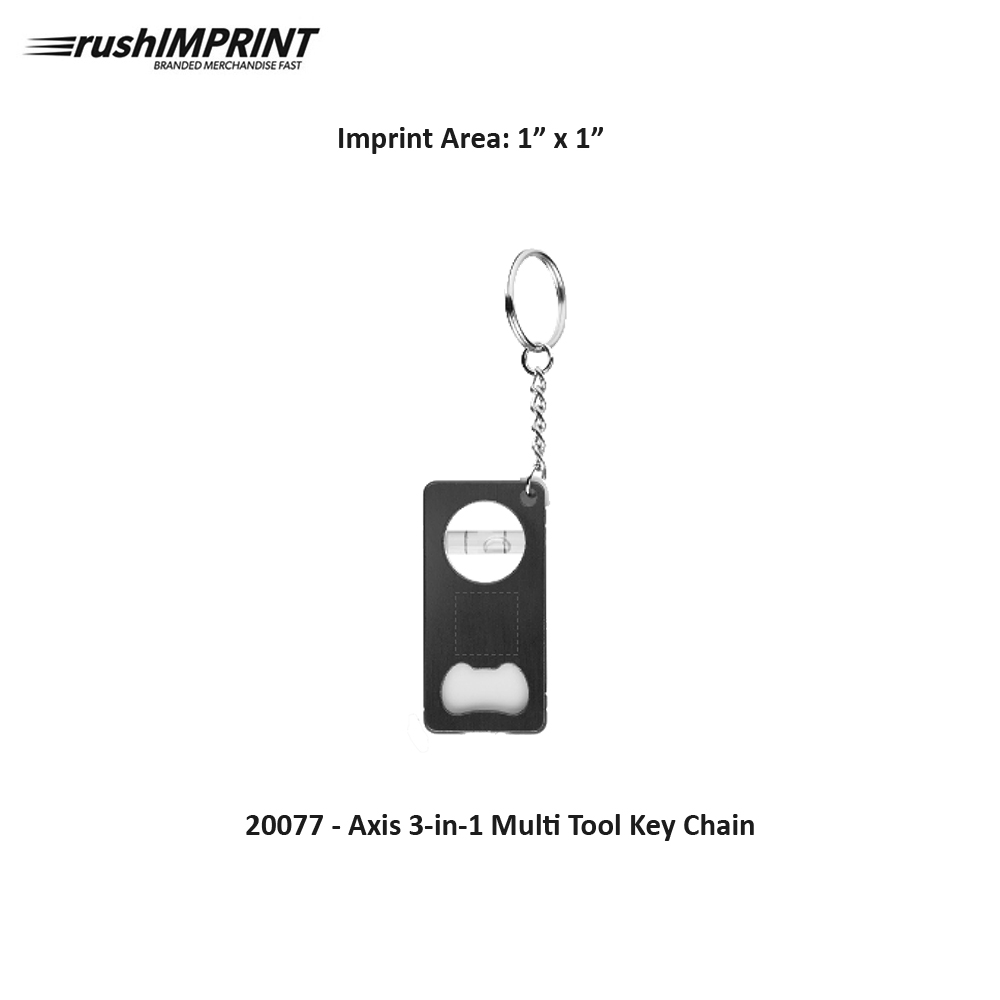 Includes Tape Measure, Level And Bottle Opener. 3' Retractable Steel Tape. Metric/Inch Scale. Split Ring Attachment. Price includes one color, one location imprint.