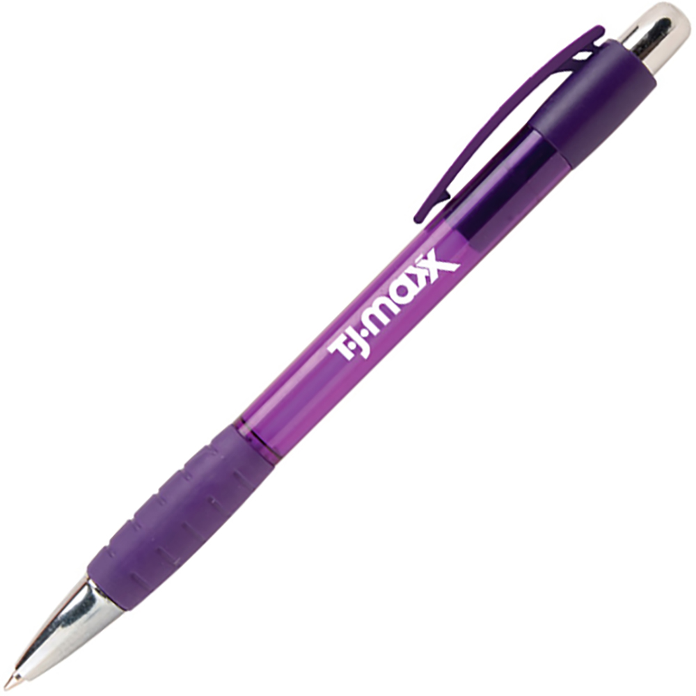 Contemporary styling with a slim outline. Hot translucent colors with matching ribbed grip. Available with blue or black ink (blue ink default). Material: Plastic. Mechanism: Push Retractable. Tip Type: Ballpoint. Blue Ink. Price includes one color, one location imprint.