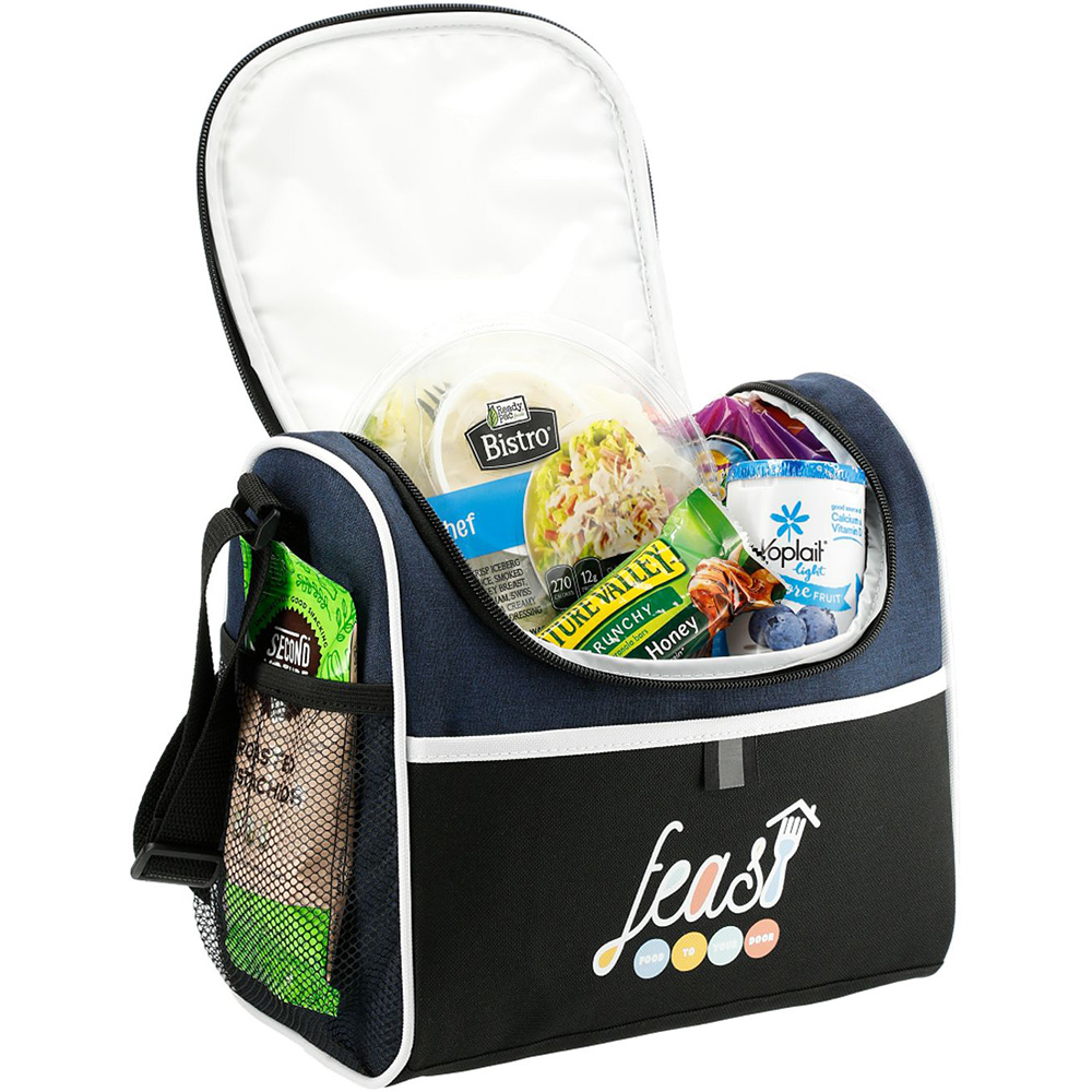 The Break Time Lunch Cooler offers a spacious main compartment with insulated PEVA lining, a side mesh pocket for your water bottle or extra snacks, and two slip pockets located on the front and top. It features durable PolyCanvas construction and has multiple decorating locations to showcase your logo. With a top grab-handle and adjustable shoulder strap, this lightweight lunch cooler is easy to take anywhere. There may be minor color variations in each item due to the nature of the fabric dyes, weaves, and printing.