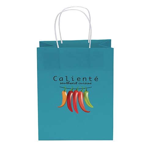 Brightly colored 75# matte paper bag with a fold-over top and white twisted paper handles. Available in a variety of colors: Brite Blue,Teal,Yellow,Lime,Pink. Price includes full color imprint.