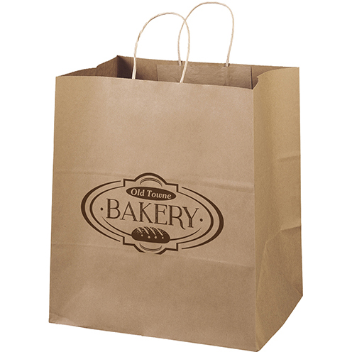 Brown kraft shoppers made from 100% recycled paper (with a minimum of 95% recycled post-consumer content) with matching twisted paper handles and serrated cut top. Price includes one color imprint, one location. Free Proof prior to production.