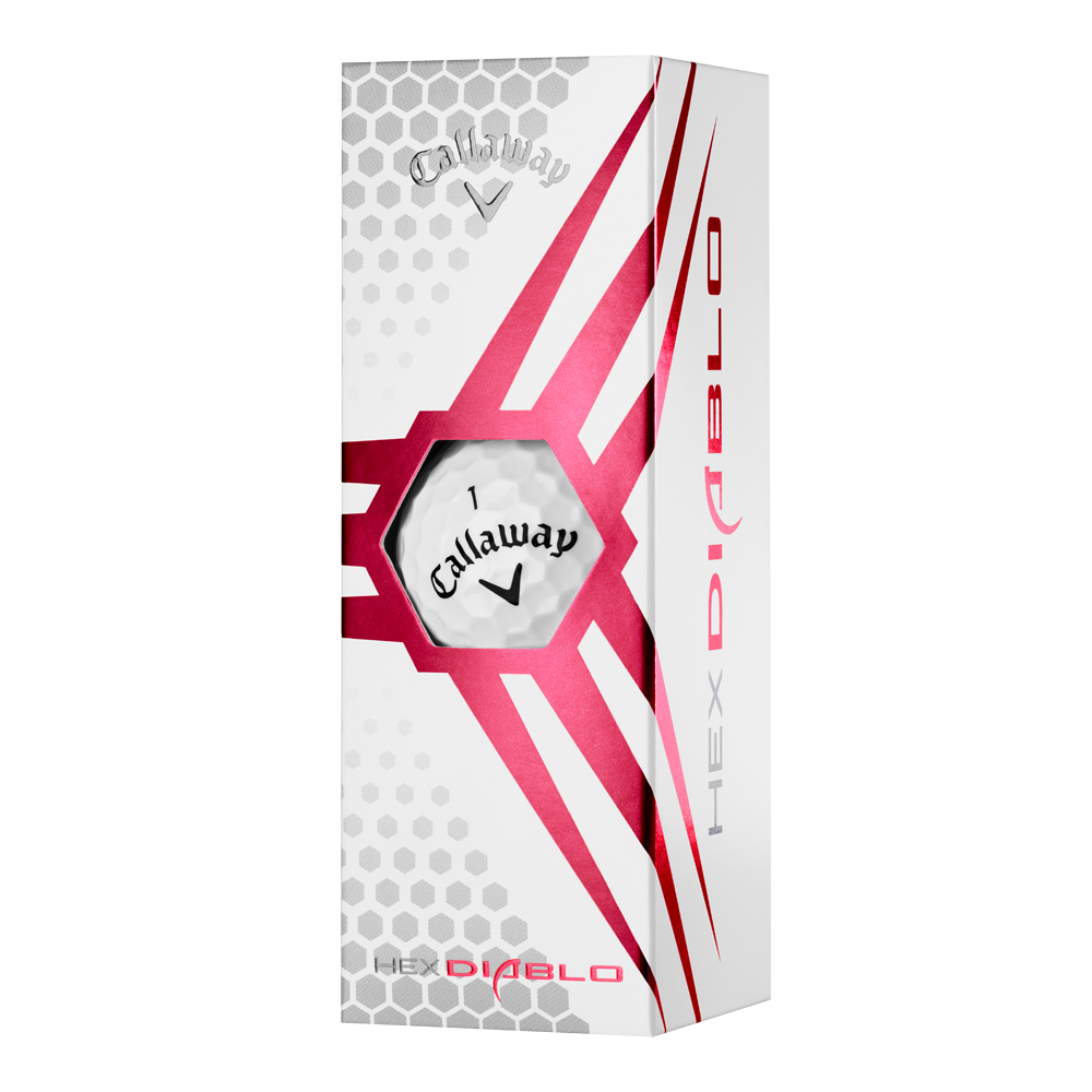 Callaway Diablo has been one of the most popular golf balls for years. HEX Aerodynamics pattern increases lift. Trionomer over promotes low driver spin for long straight drives. Two-piece golf ball. The Callaway Hex Diablo has high resiliency to increase ball velocity for long distance with incredibly soft feel. With its ionomer cover the Diablo promotes optimal, low driver spin for devilishly long drives. Hex aerodynamics replaces conventional dimples to reduce drag for a more penetrating ball flight. Box contains 12 White Golf Balls. Price includes full color imprint.
