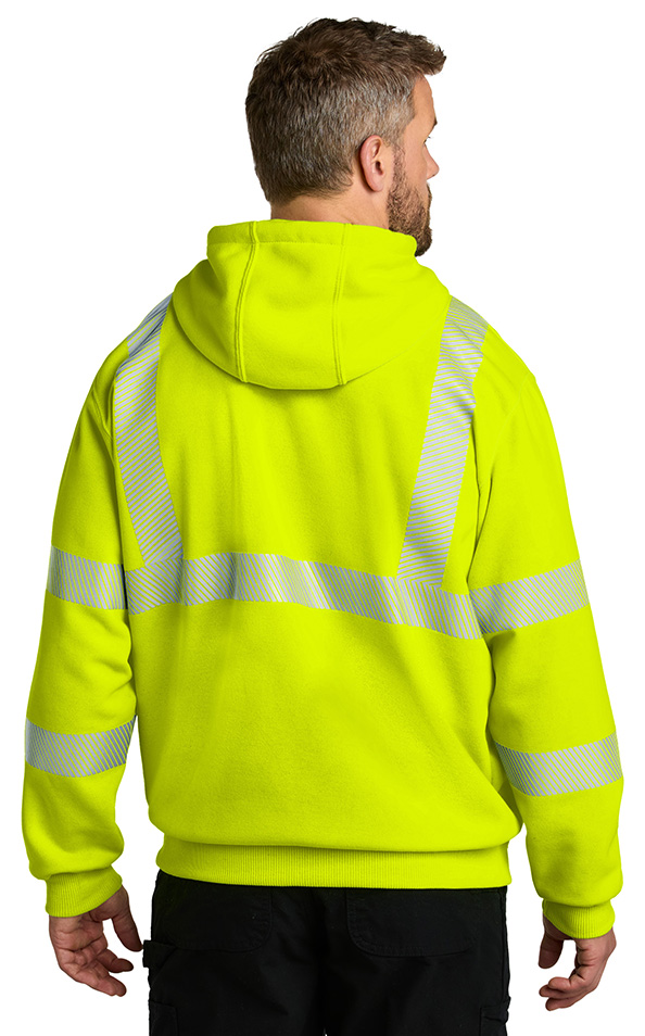 Stay seen and stay dry on the site in this high visibility sweatshirt that meets ANSI/ISEA 107 Class 3 standards.. 10.5-ounce, 100% polyester. Meets ANSI 107 Class 3, Type R visibility standards. 3M Scotchlite reflective material segmented for breathability. Rain Defender durable water repellent. Three-piece adjustable hood. Locker loop. Hidden media pocket inside right handwarmer pocket. Stretchable, spandex-reinforced, rib knit cuffs and waistband. Front handwarmer pocket with flaps for security. Carhartt label sewn on left handwarmer pocket. Reflective material maintains performance through 75 home launderings. Loose fit. Price includes embroidery.