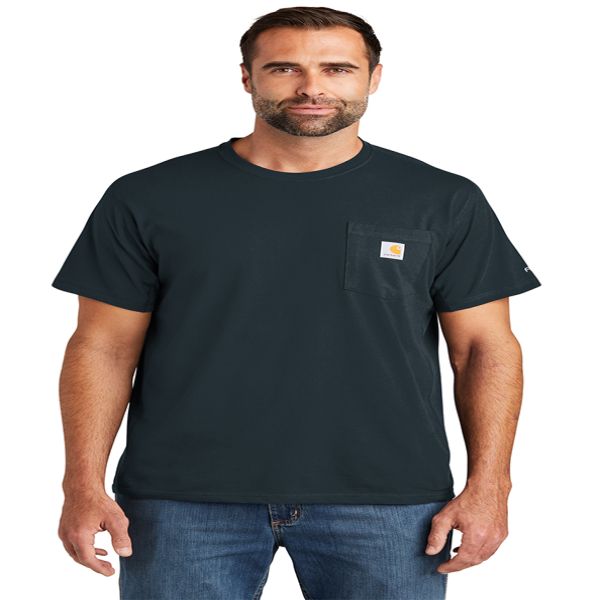 This midweight pocket tee fights sweat and is built for hard work thanks to Carhartt Force technology. Durable 5.75-ounce, 65/35 cotton/poly stretch plaited jersey knit. 59/41 cotton/poly stretch plaited jersey knit (Heather Grey). 60/40 poly/cotton stretch plaited jersey knit (Other Heathers). Carhartt Force technology wicks sweat, dries fast and fights odors. FastDry technology keeps you cool for all-day comfort. UPF 25+. Raglan sleeves to increase range of motion. Left chest pocket with pen stall. Tagless neck label. Smooth flatlock seams. Ventilated side panels. Drop tail hem. Carhartt label sewn on left chest pocket. Carhartt Force labeling on left sleeve. Relaxed fit. Price includes one color, one location imprint.