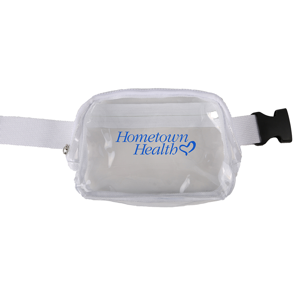 Constructed of clear 0.2mm PVC and webbed strap. Features two zipper pockets. Black buckle closure and an adjustable strap for a perfect fit. Price includes one colour, one location imprint.