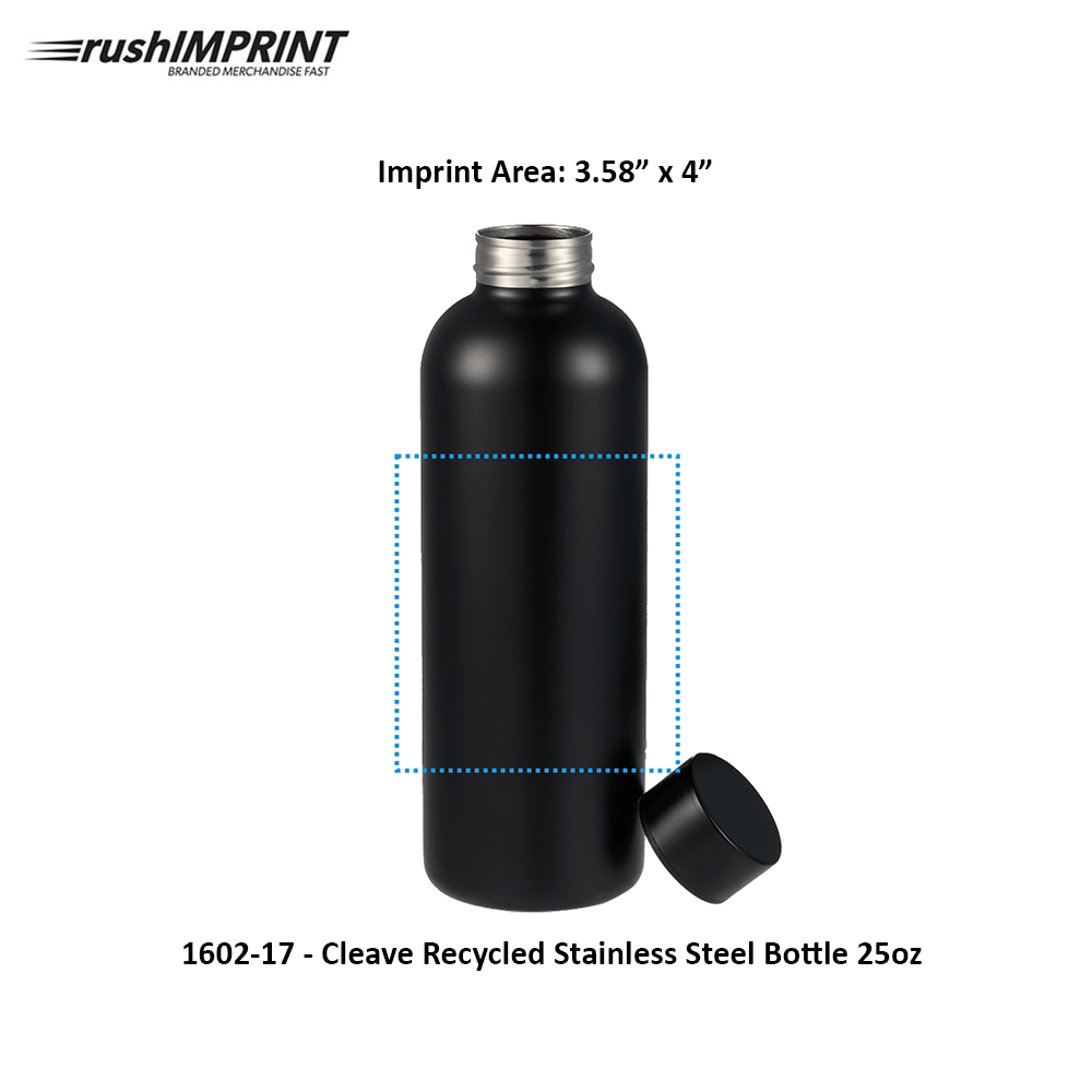 Enjoy your favorite beverages on the go with the trendiest Cleave Recycled Single Wall Stainless Steel Bottle 25oz. It features single-wall, lightweight and compact recycled stainless-steel construction. It includes a screw-on metal lid that is 100% leakproof. Great for sports, travel, and corporate giveaways. Crafted from 91% post-consumer recycled 18/8 stainless steel. Hand-wash only. Features. Screw-on metal lid that is 100% leakproof. Lightweight and compact. Made from recycled stainless steel. Price includes one color, one location imprint.