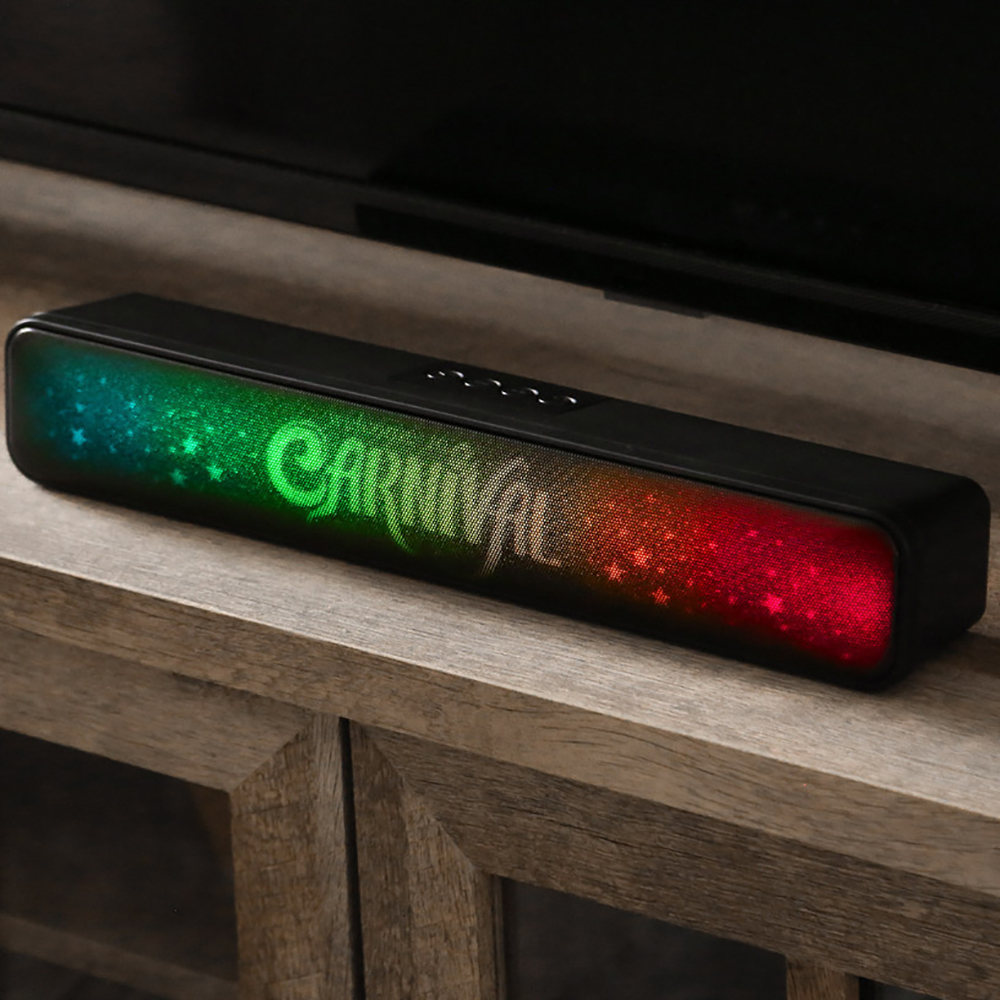 The ColorWav sound bar adds a new dynamic to your home sound system with its slim black construction and RGB-illuminated grill. Its multi-colored lights behind the grill light up your logo and create an impressive statement while high-quality sound fills the room. The compact size is perfect for various spaces, and the full-color packaging makes it an ideal gift for staff or VIP clients. 10 watt sound bar. Changing LED lights behind grill illuminate logo. Can be set to 1 color to match brand?. Retail-inspired packaging. FCC, CA Prop 65, CPSIA certified?. Material: ABS, Aluminum. Price includes translucent imprint.