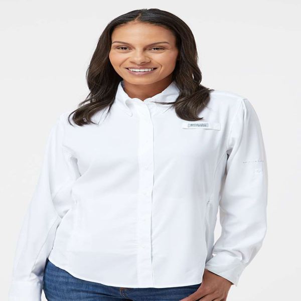 100% polyester ripstop. Omni-SHADE UPF 40 sun protection. Omni-WICK. Vented. Roll-up sleeve. Zippered hand pockets. Rod holder. Columbia woven patch logo on left chest. Price includes embroidery.
