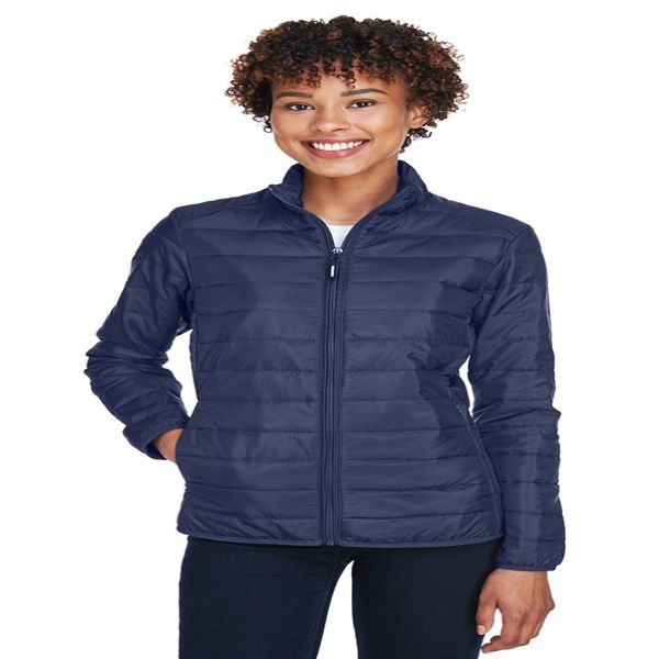 Fabric: Body: 1.2 oz.yd/² / 39 gsm, 100% polyester with water-resistant finish. Lining: 100% polyester. Insulation: 80 gsm thermal poly fill in body and sleeves. Features: Packable style into separate storage pouch. Center front reverse coil zipper with autolock slider and rubber toggle. Lower pockets with invisible zippers. Stretch binding at sleeve and hem. Your price includes embroidery on the left chest.