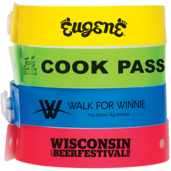 Custom L-Shaped Plastic Tri-Laminate Wristbands are perfect when you need a strong, high-security wristband that can't be transferred! Waterproof material and locking plastic snap make this wristband ideal for multi-day use. Price includes one color, one location imprint.
