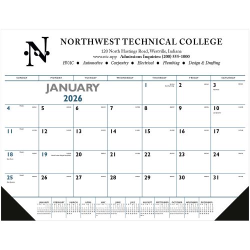 Desk pads keep a customer's name in front of potential clients on a daily basis. Vinyl corners provide an attractive frame and durability. Style 6504 Blue matches PMS308. Grid includes Julian dates. Price includes one color imprint.