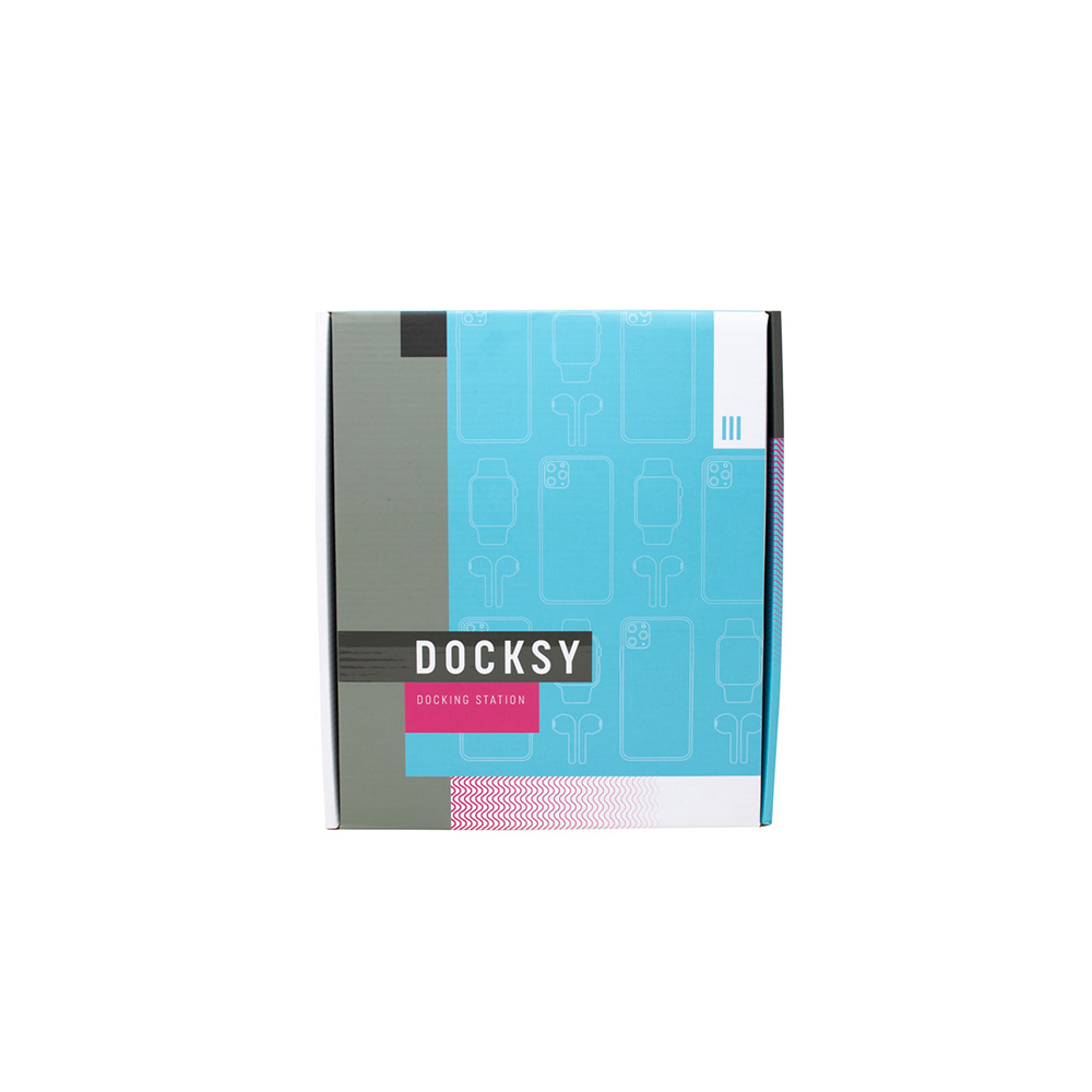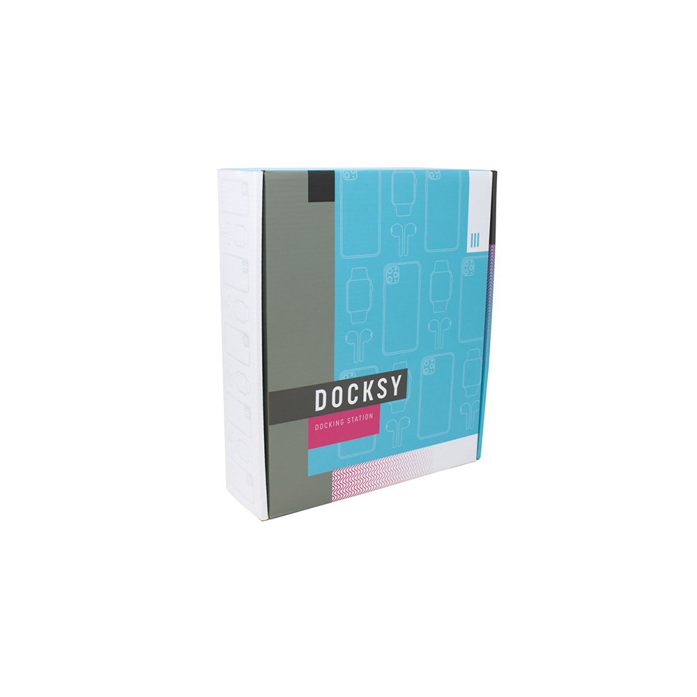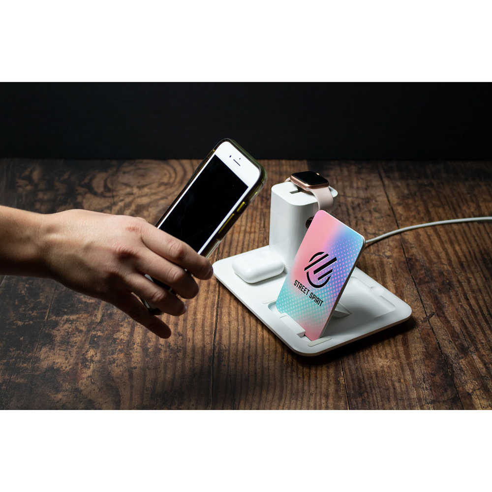 Tired of fumbling with messy wires and unsafe charging cords? The Docksy is your three-in-one charging solution. Ideal for a nightstand or counter, the Docksy allows you to recharge each of your smart devices at once! Set up your own charging cord in the organization tower to charge your smart watch and ear buds. Place your phone on the imprinted stand, propped up or down, to wirelessly charge up your device. Charges wireless charging compatible smartphones. Includes multifunctional cable management system. Spot for smart watch to charge via charging cord (not included). Spot for ear pod case to charge via charging cord (not included). Price includes full color imprint.