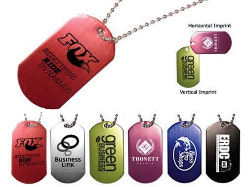 Lightweight and durable custom dog tag available in 6 colors. Beaded chain approx. 23 1/2'. Anodized aluminum material. Promotional dog tags put your message in prominent display. Price includes a one color imprint. Product dimensions: 2.06" x 1.13" - 0.03 lbs. Imprint dimensions: 0.75" x 1.25". Minimum order of 250 pcs. No hidden fees!