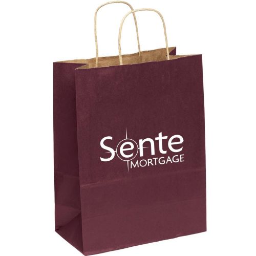 Matte paper shopper with serrated cut top and twisted kraft paper handles. Price includes 1 color foil imprint. Free Proof prior to production.